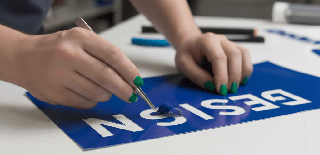 Este material se carga en un plotter, una máquina que utiliza una cuchilla muy fina para recorrer las líneas de tu diseño. La cuchilla corta solo el vinilo sin traspasar el papel protector trasero. Posteriormente, un operario debe realizar el proceso de «pelado» o descartes, retirando manualmente todo el material sobrante, dejando solo las letras o formas que componen tu marca.